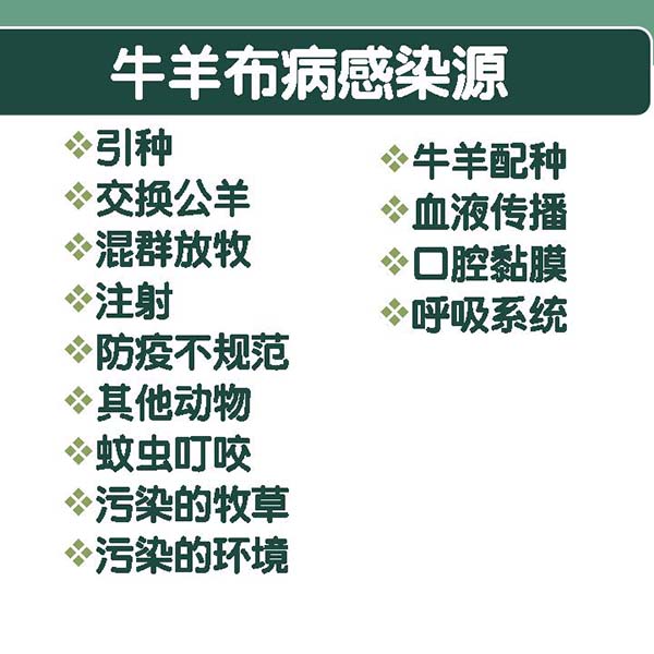 1、加强检疫提倡自繁自养,不从外地购买家畜。新购入的家畜,必须隔离观察一个月,并做两次布鲁氏杆菌检疫,确认健康后,方能合群。每年配种前,种公畜也必须进行检疫,确认健康后方能配种。养殖场每年需做两次检疫,检出的病畜,应严格隔离饲养,固定放牧地点及饮水场,严禁与健康畜接触。