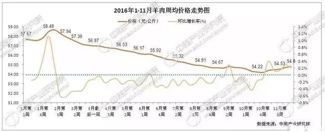 近两年养羊行情一直不太好,羊价持续走低。2016年进入2月份就持续走低,直到最近一个月才企稳略涨。据农业部对全国500个集贸市场畜禽产品和饲料价格定点监测,12月份第2周(采集日为12月14日)全国羊肉平均价格55.13元/公斤,比前一周上涨0.3%,但同比下降了5.8%。